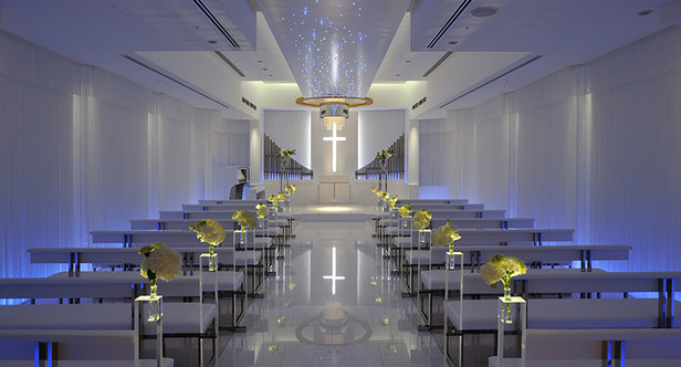 光のチャペル「サンティエ」はバージンロードの上にスワロフスキーの12星座がキラキラと輝き、ふたりが歩む人生をみちしるべのように優しく照らしてくれます。思わずウットリしてしまうロマンチックな空間。