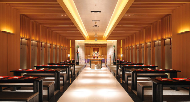 神殿「幸福殿」も、日本の伝統を大切にしながら、木のぬくもりの中に 黒と赤が映える和モダンな空間が新しさも感じる造り。古式ゆかしい厳かな神前式もアロマの香りがリラックスさせてくれる。
